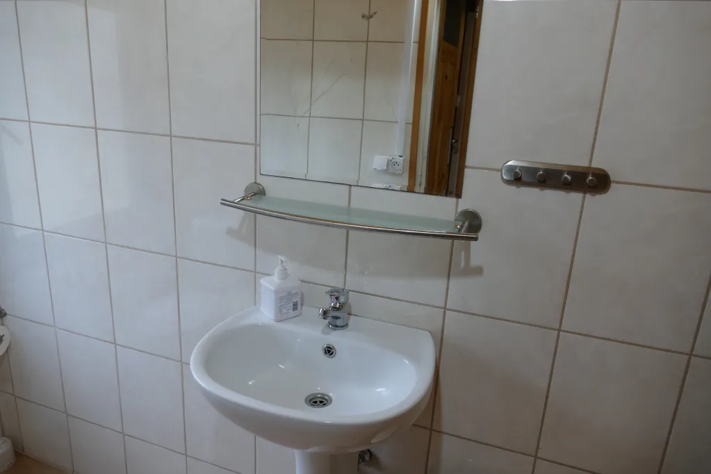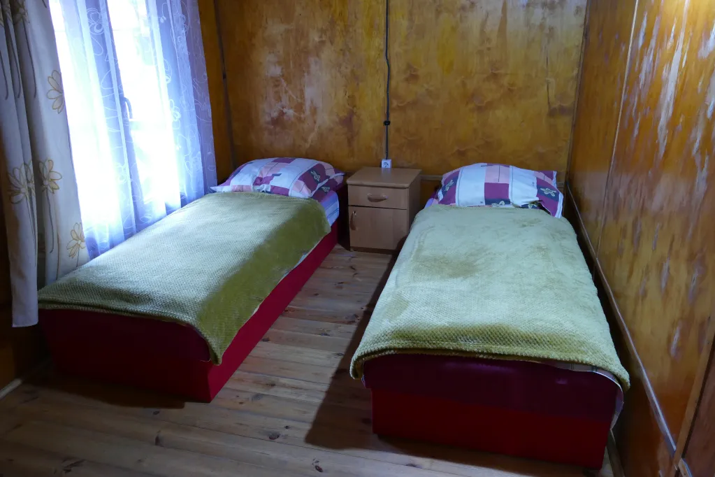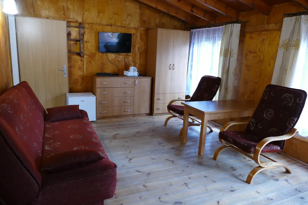 Domki z łazienkami składają się z 3 sypialni 2-osobowych połączonych salonem. Każdy domek wyposażony jest w telewizor, lodówkę, czajnik oraz pościel.