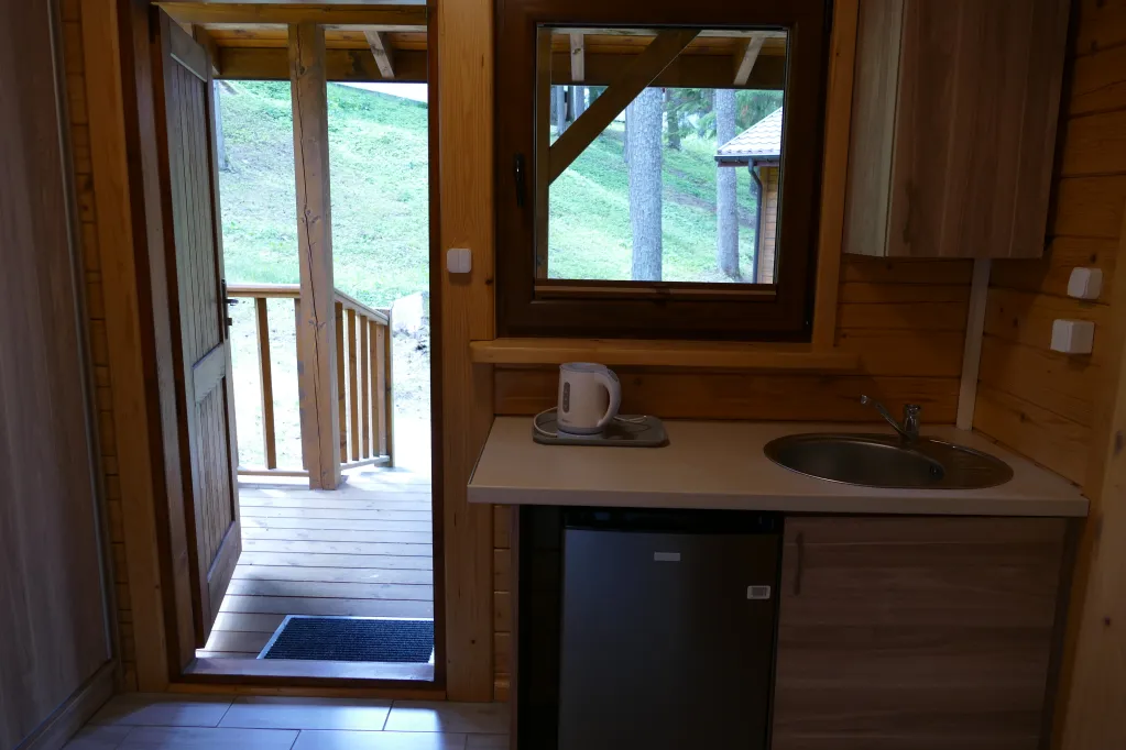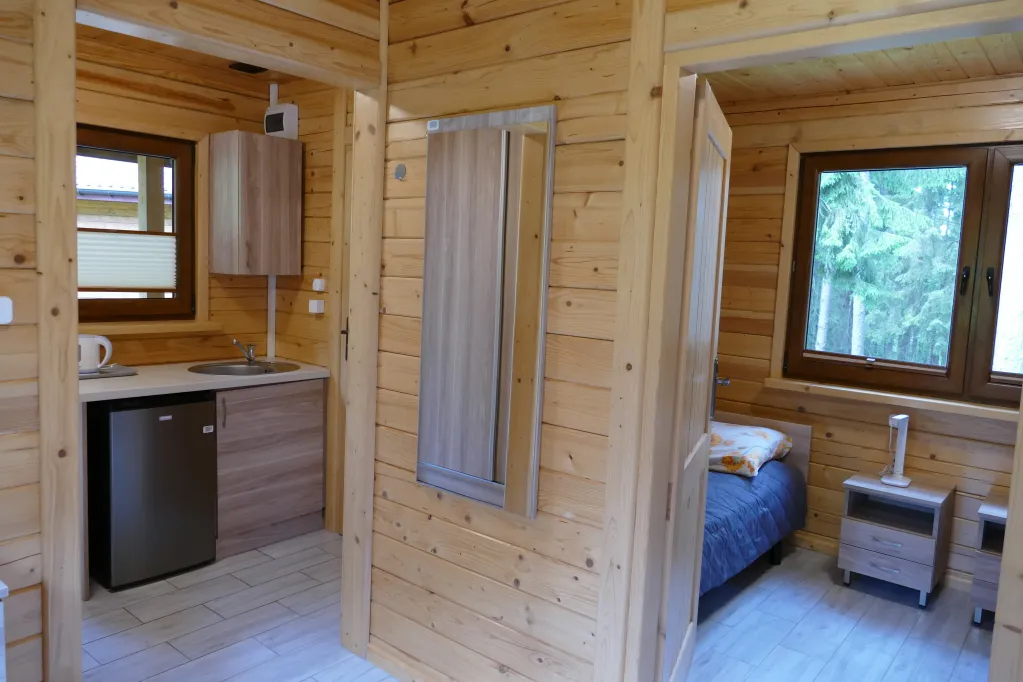 Domki z łazienkami składają się z sypialni i salonu. W domku znajdują się 2 łóżka i kanapa rozkładana. Każdy domek wyposażony jest w telewizor, lodówkę, czajnik, pościel oraz komplet ręczników.